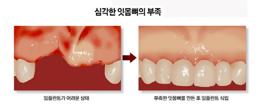관련의는 "치주질환이나 기타 선/후천적 요인에 의해 잇몸뼈가 심하게 부족하면 자가골 이식을 위해 외과적 수술과 입원이 가능한 대학병원에서만 임플란트가 가능할 것이라는 진단을 받는 환자들이 있다. 이식재를 넣는 골이식술 만으로는 불가능할 수 있지만 골이식술 외에도 골유도재생술, 골신장술, 골성장인자이용법 등 구강 내에서 할 수 있는 뼈를 만드는 여러가지 방법을 복합적으로 활용하면 치료기간이 다소 길어져도 임플란트가 가능할 만큼 잇몸뼈를 재건해낼 수 있다."고 조언했다.