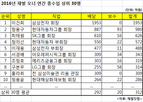 7일 재벌닷컴과 각사의 2016회계연도 사업보고서에 따르면 작년 배당금과 급여·상여, 퇴직금, 스톡옵션 행사 등의 보수를 합한 연간 수입을 집계한 결과 오너 경영자 상위 30명이 받아간 수입은 평균 312억원으로 집계됐다.