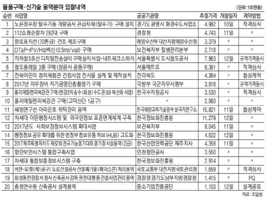 물품구매로는 서울도시철공사의 '지하철 5호선 디지털전송설비 구매설치사업'이 79억6300만원 규모로 규격가격 동시계약을 통해 오는 12일 개찰하고, 경찰청의 '112 소형 순찰차 282대 구매'가 47억4300만원 규모로, 오는 11일 개찰을 통해 집행된다.