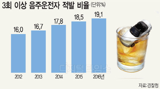음주운전, 특히 음주운전 '3진 아웃'은 비단 강정호만의 문제가 아닙니다. 음주운전 처벌 강화, 3진아웃 등의 제도로 인해 2013년 이후 음주운전 적발 건수의 절대적 수치는 감소하고 있지만 3회 이상 음주운전에 적발된 비율은 매년 증가하고 있는 추세 입니다.