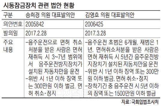 한국 역시 18대 19대 국회에서 시동잠금장치 도입을 골자로 하는 '도로교통법' 개정안이 각각 1건씩 발의됐습니다. 하지만 사전준비 부족, 가족의 자동차 공동사 용에 따른 불편, 다른 자동차 이용을 통한 회피 및 대리측정 가능성, 낮은 재범방지 효 과 등의 이유로 도입은 실현되지 못했습니다. 20대 국회 들어서도 2건의 개정안이 발의돼 현재 안전행정위에 계류 중입니다.