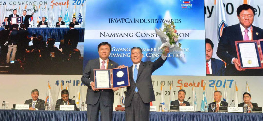 호남지역 중견 건설업체인 남양건설㈜(회장 마형렬·오른쪽)이 아시아와 서태평양 지역 18개 국가 건설단체들의 국제행사인 '제43차 이포카(IFAWPCA) 한국대회'에서 건설산업 상을 받았다.
