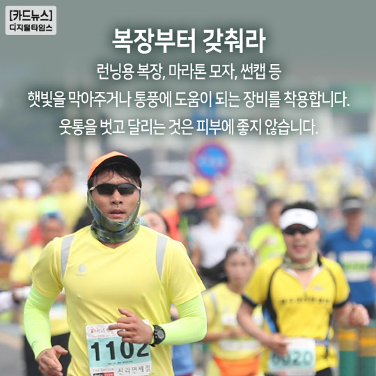 런닝용 복장, 마라톤 모자, 썬캡 등 햇빛을 막아주거나 통풍에 도움이 되는 장비를 착용합니다.
