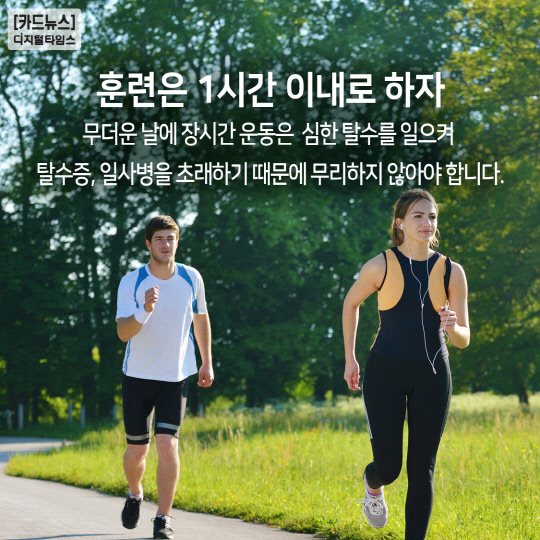 무더운 날에 장시간 운동은 심한 탈수를 일으켜 탈수증, 일사병을 초래하기 때문에 무리하지 않아야 합니다.
