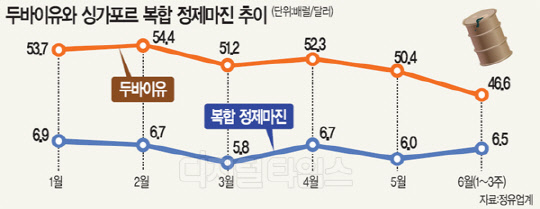 두바이유 이달 23일 44.17달러 1월 53.71달러서 반년새 18%↓ WTI·브렌트유도 17%씩 하락 SK이노 등 국내 정유 4개사 재고평가손실·정제마진 약세로 2분기 영업익 30%감소 '먹구름'