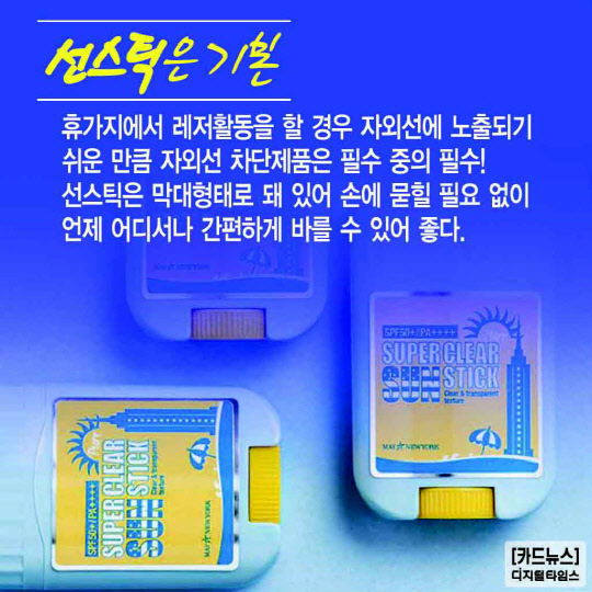 휴가지에서 레저활동을 할 경우 자외선에 노출되기 쉬운 만큼 자외선 차단제품은 필수 중의 필수! 선스틱은 막대형태로 돼 있어 손에 묻힐 필요 없이 언제 어디서나 간편하게 바를 수 있어 좋다.