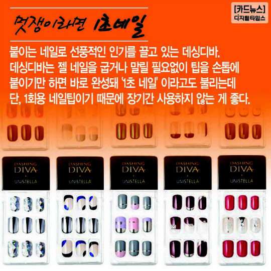 붙이는 네일로 선풍적인 인기를 끌고 있는 데싱디바.데싱디바는 젤 네일을 굽거나 말릴 필요없이 팁을 손톱에 붙이기만 하면 바로 완성돼 '1초 네일'이라고도 불리는데 단, 1회용 네일팁이기 때문에 장기간 사용하지 않는 게 좋다.