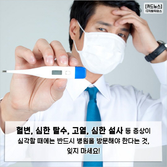 5. 혈변, 심한 탈수, 고열, 심한 설사 등 증상이 심각할 때에는 반드시 병원을 방문해야 한다는 것, 잊지 마세요!