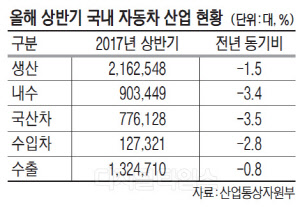 올 상반기 국내 자동차 생산은 지난해보다 1.5% 감소한 216만2548대에 그쳤다. 2010년부터 2012년까지 매년 성장을 이어왔던 국내 자동차 생산은 2013년 한 차례 감소했지만, 곧바로 다음 해인 2014년 증가세로 돌아섰다. 하지만 이후 3년째 생산 감소가 이어지고 있다. 한국의 자동차 생산국 순위는 전 세계 5위에서 6위로 한 계단 떨어졌다.