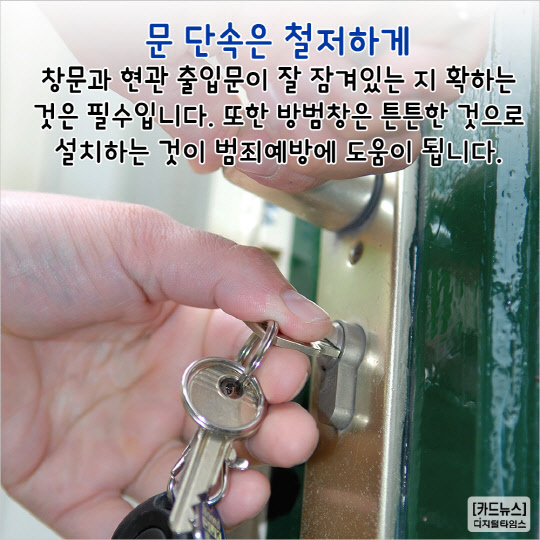 창문과 현관 출입문이 잘 잠겨있는 지 확하는 것은 필수입니다. 또한 방범창은 튼튼한 것으로 설치하는 것이 범죄예방에 도움이 됩니다.