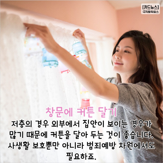 저층의 경우 외부에서 집안이 보이는 경우가 많기 때문에 커튼을 달아 두는 것이 좋습니다. 사생활 보호뿐만 아니라 범죄예방 차원에서도 필요하죠.