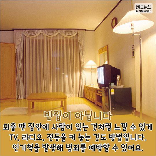 외출 땐 집안에 사람이 있는 것처럼 느낄 수 있게 TV, 라디오, 전등을 켜 놓는 것도 방법입니다. 인기척을 발생해 범죄를 예방할 수 있어요.