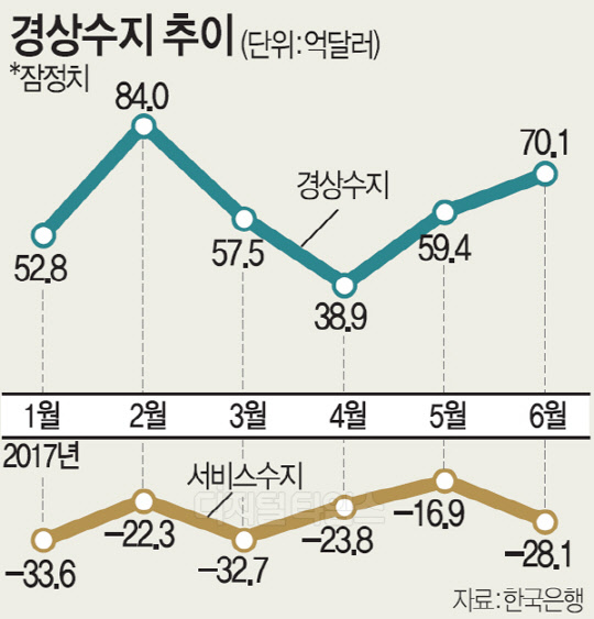 전체 경상수지는 362억7000만 달러의 흑자를 기록, 지난해 상반기(516억9000만달러)보다 154억2000만달러 감소했다. 6월 경상수지 흑자는 70억1000만 달러로 지난 2012년 3월부터 64개월 연속 흑자 행진을 하면서 사상 최장 흑자 기록을 다시 썼다.