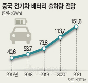 4일 배터리 업계에 따르면 중국 전기차 배터리 출하량은 올해 40.6GWh에서 오는 2021년 151.6GWh로 약 4배 급증할 전망이다.