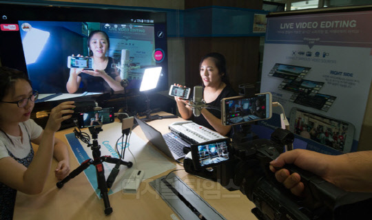 누구나 자유롭게 콘텐츠를 만들어 공유할 수 있는 1인 방송시대에 맞춰 값비싼 장비없이 애플리케이션 하나로 비디오와 오디오 등을 결합해 고화질의 방송을 생중계 할 수 있는 애플리케이션들이 개발되고 있다. 6일 서울 용산구 볼트마이크로 본사에서 직원들이 '카메라파이 라이브' 애플리케이션을 통해 유튜브로 고화질 생중계 콘텐츠를 송출하고 있다.