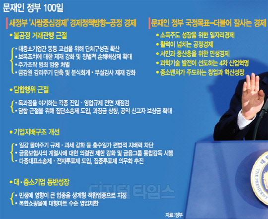 ◇일자리 중심 경제, 공정거래 확보 두드려져=문재인 정부는 출범 100일 동안 소득 주도 성장, 일자리 중심 경제, 공정 경제, 혁신 성장을 제시하면서 대기업 중심의 경제정책 패러다임을 일대 전환하고 재벌개혁에 방점을 맞췄다.