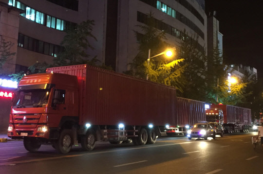 중국 정부가 15일부터 북한산 석탄과 철·수산물 등을 전면 수입 금지한다고 밝힌 지난 14일 밤 해당 품목을 합법적으로 중국에 수출할 마지막 시한까지 수출물량을 보내려는 북한의 무역차량이 북·중 접경지대인 단둥 시내에 줄을 잇고 있다. 사진은 단둥시내에 가득한 북한 트럭.