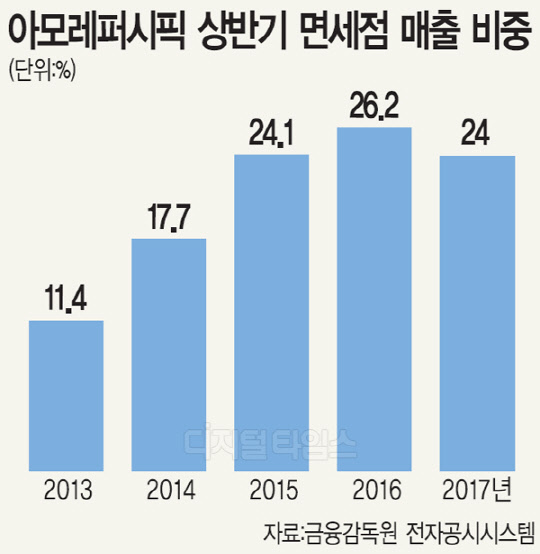 면세점 매출 비중은 2015년(24.1%) 처음으로 20%대를 돌파했고, 지난해에는 26.2%까지 치고 올라와 성장 가도를 달리는 듯했다. 전문점, 백화점과의 매출 비중 격차도 3∼5배로 확대됐다. 그러나 사드 영향으로 면세점 매출이 지난해 같은 기간보다 14.7% 줄어들면서 상승세가 꺾였다. 아모레퍼시픽 관계자는 "그동안 내수시장 불경기를 떠받쳐 왔던 게 중국인 관광객"이라며 "중국인 관광객을 제외한 내수 지표는 원래 좋지 않았기 때문에 상품과 서비스 혁신으로 이를 다잡아야 할 시점"이라고 말했다.