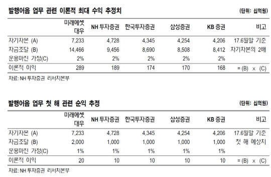 원 연구원은 "발행어음 업무가 허용되고 증권사가 첫해에 인식하는 관련 순익은 증권사당 연 100억원 내외가 될 것으로 예상한다"며 "다만 시간이 지나면서 증권사당 8조원까지 자금조달 규모가 증가하고 운용마진이 2%까지 개선된다고 가정하면 이론적으로 1600억원까지도 순익 개선이 가능하다"고 분석했다.