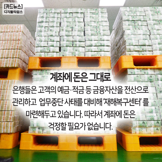 은행들은 고객의 예금·적금 등 금융자산을 전산으로 관리하고 업무중단 사태를 대비해 '재해복구센터' 를 마련해두고 있습니다. 따라서 계좌에 돈은 걱정할 필요가 없습니다.