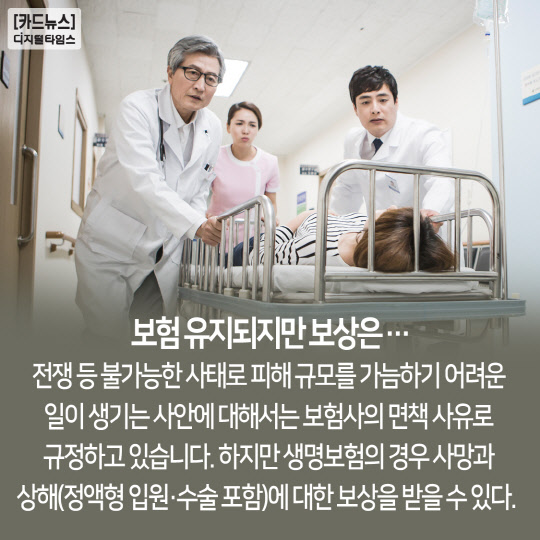 전쟁 등 불가능한 사태로 피해 규모를 가늠하기 어려운 일이 생기는 사안에 대해서는 보험사의 면책 사유로 규정하고 있습니다.