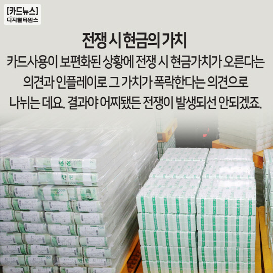 카드사용이 보편화된 상황에 전쟁 시 현금가치가 오른다는 의견과 인플레이로 그 가치가 폭락한다는 의견으로 나눠지는 데요. 결과야 어찌됐든 전쟁이 발생되선 안되겠죠.