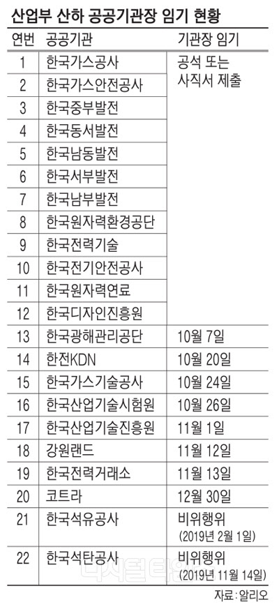 가스공사·발전자회사 등 사직서 올 임기 종료·공석 20곳 포함 "친 문재인 낙하산 인사 경계" 투명·공정 인사 목소리 높아