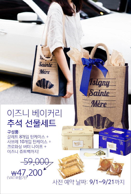 추석을 맞아 준비한 추석 선물세트는 전무후무한 '프랑스 스타일' 추석 선물로 구성됐다. 소비자들은 이를 통해 이즈니 베이커리만의 프랑스 느낌 베이커리 세트를 접하는 것이 가능하다. 해당 선물 세트는 종류는 4개 상품 세트, 그리고 2개 상품 세트의 2가지 형태로 나뉘어 판매되고 있다.