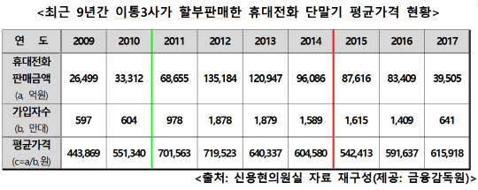 11일 국회 과학기술정보방송통신위원회 소속 신용현 의원(국민의당)이 금융감독원으로부터 제출받은 '최근 9년간 이통3사가 할부판매한 휴대전화 단말기 평균가격 현황'에 따르면 2017년 기준 단말기 평균가격은 61만5918원인 것으로 나타났다. 24개월 기준 할부수수료는 3만8591원으로, 할부수수료까지 포함해 국민이 1인당 실제 부담하는 단말기 가격은 평균 65만4509원이다.