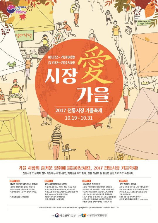 '떠나요 가을여행, 즐겨요 가을시장'을 주제로 열리는 이 축제에는 문화공연과 체험행사, 경품이벤트, 특가판매 등 다채로운 프로그램이 진행된다. 또 전통시장의 고객서비스 향상을 위해 '고객서비스 3대 혁신 운동(카드결제·현금영수증 발급, 가격표시·품질 및 교환, 위생·청결·친절)'이 펼쳐진다. 특히 전국 17개 거점시장은 시장별 입지·특성 등을 고려한 '체감·공감·소통형 프로그램'을 통해 축제 분위기를 이끌고, 만화캐릭터 스탬프 투어, 전통시장 방문 인증샷 등 다양한 이벤트도 열린다.