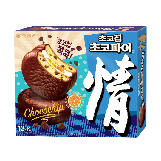 초코칩 초코파이는 빵 속에 오독오독 씹히는 초코칩과 깊은 풍미의 초콜릿 청크가 콕콕 박혀 있어 독특한 식감과 진한 초콜릿 맛을 동시에 느낄 수 있다. 마쉬멜로 속에는 상큼한 오렌지 잼이 들어 있어 깔끔한 단맛을 즐길 수 있다. 패키지에는 1974년 출시 초기 색상인 파란색을 활용해 '다시 시작한다'는 의미를 담았다.