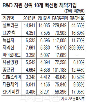 셀트리온이 지난해 45개 혁신형 제약기업 중 가장 많은 정부 지원을 받은 것으로 나타났다. 혁신형 제약기업은 '제약산업 육성 및 지원에 관한 특별법'에 따라 일정 규모 이상 R&D 투자를 하는 기업 중 보건복지부 장관이 인증한 기업으로 약가우대, 세제지원 등 혜택이 주어진다.