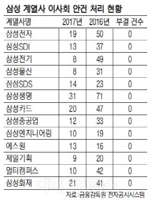 16일 재계와 금융감독원 등에 따르면 삼성전자를 비롯해 삼성물산, 삼성생명 등 총 16개의 삼성 상장 계열사는 작년부터 올해 상반기까지 259회 이사회를 열어 799건의 안건을 모두 '가결' 처리했다. 보류 또는 부결은 단 한 건도 없었다.