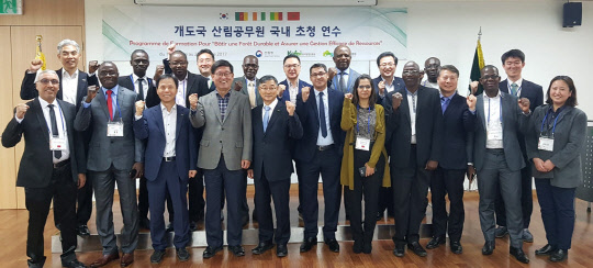 한국임업진흥원이 16일 강서구 본원 회의실에서 개도국 산림공무원 연수자들을 대상으로 초청연수 과정의 입교식을 개최해 기념사진을 촬영하고 있다. '지속가능한 산림조성 및 자원관리'라는 주제로 4개국(카메룬, 모로코, 코트디부아르, 말리)의 연수자들에게 강의와 현장학습을 시행한다.