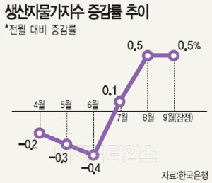 한국은행이 23일 발표한 9월 생산자물가 잠정치는 102.81(2010=100)로 8월보다 0.5% 올랐다.