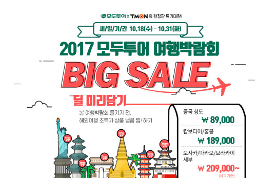 이번 기획전에서는 캄보디아 3박 5일 패키지를 27만9000원, 보라카이 3박 4일 패키지를 29만9000원에 선보인다. 또 다음 달 출발하는 닛코 호텔 3박 5일 패키지는 3만원 즉시 할인을 적용, 41만9000원에 살 수 있다. 이달 29일, 30일에 떠나는 3박 5일 괌 힐튼 세미 패키지는 2만원 즉시 할인을 적용해 47만9000원에, 다음 달 출발하는 일정은 56만9000원부터 구입 가능하다.
