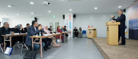 김판석 인사혁신처장이 23일 세종시 어진동 사옥에서 튀니지 총리실 및 산하기관 공무원들을 대상으로 우리 공무원 역량강화 체계에 대해 설명하고 있다. 튀니지 공무원들은 한국의 공무원 인사시스템을 배우기 위해 최근 방한했다.