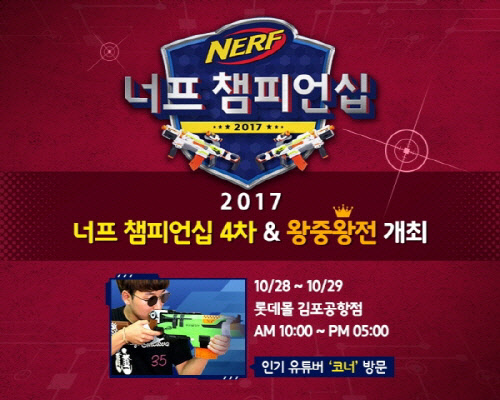 29일에는 3시~5시에는 올해 대회 우승자들이 모여 2017년 최고의 너프 플레이어를 뽑는 왕중왕전이 진행된다. 이 자리에 유튜브 크리에이터로 어린이들의 인기를 한 몸에 받고 있는 '코너(korner)'가 행사장을 찾아 너프 마니아들과 신나는 시간을 보낼 예정이다.