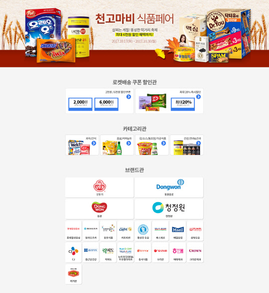 이번 행사에는 46개 국내 대표 식품 업체가 참여해 총 2100여 개 상품을 할인 판매한다. 과자/간식, 음료/커피·차, 김/소스/통조림/가공식품, 건강/견과·건과 등 4개 카테고리로 각각 제품을 분류했다. 브랜드관에서는 오뚜기, 동원, CJ 등 회사별로 나눠 총 21개 국내 유명 브랜드의 상품을 선보인다.