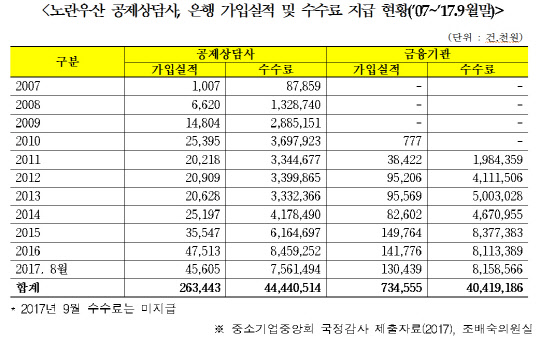 중앙회는 시중은행과 노란우산공제 판매대행 협약을 맺고, 첫달 공제부금 납입액의 30%(건당 최대 12만6000원)를 은행에 '가입권유수당'으로 지급하고 있다. 2011년 19억원, 2012년 41억원, 2013년 50억원, 2014년 46억원, 2015년 83억원, 2016년 81억원, 올해 8월 현재 81억원 등이다.