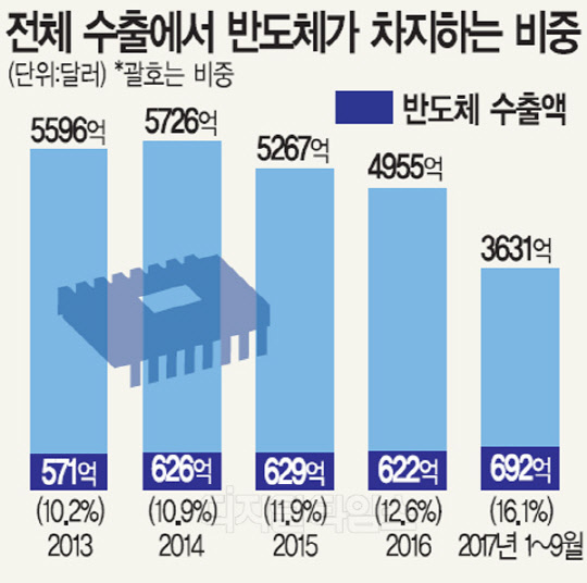 문제는 전체 수출의 약 5분의 1이 반도체에 쏠려있다는 점이다. 산업통상자원부가 집계한 전체 수출에서 차지하는 반도체의 비중은 2013년 10.2%에서 올해 16.1%(9월 말까지)로 늘어났다.