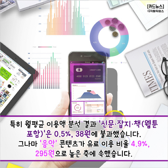 2. 특히 월평균 이용액 분석 결과 '신문·잡지·책(웹툰 포함)'은 0.5%, 38원에 불과했습니다. 그나마 '음악' 콘텐츠가 유료 이용 비율 4.9%, 295원으로 높은 축에 속했습니다.