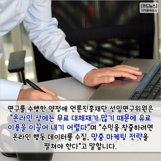 3.연구를 수행한 양정애 언론진흥재단 선임연구위원은 "온라인 상에는 무료 대체재가 많기 때문에 유료 이용을 이끌어 내기 어렵다"며 "수익을 창출하려면 온라인 행동 데이터를 수집, 맞춤 마케팅 전략을 펼쳐야 한다"고 말합니다.