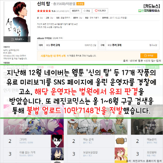 5. 지난해 12월 네이버는 웹툰 '신의 탑' 등 17개 작품의 유료 미리보기를 SNS 페이지에 올린 운영자를 경찰에 고소, 해당 운영자는 법원에서 유죄 판결을 받았습니다. 또 레진코믹스는 올 1~6월 구글 검색을 통해 불법 업로드 10만7148건을 적발했습니다.