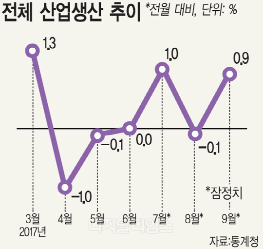 프리미엄 스마트폰 출시와 추석 명절 선물 수요가 맞물리면서 소비가 7개월 만에 가장 크게 늘어 전반적인 소비 지표가 살아나는 조짐을 보이고 있다. 10월 31일 통계청의 '9월 산업활동동향'에 따르면 지난달 전체 산업생산은 0.9% 상승했다. 지난 7월 1.0% 증가한 이후 8월에 -0.1%로 떨어졌다 다시 증가세로 돌아선 것이다.