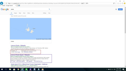 여기서 위키피디아 정보를 클릭(https://en.wikipedia.org/wiki/Liancourt_Rocks)하면 "독도 위치는 '일본해'(Location: Sea of Japan), 관할은 일본 시마네현 오키노시마"(Town: Okinoshima, Shimane Japan)라는 내용이 나온다.