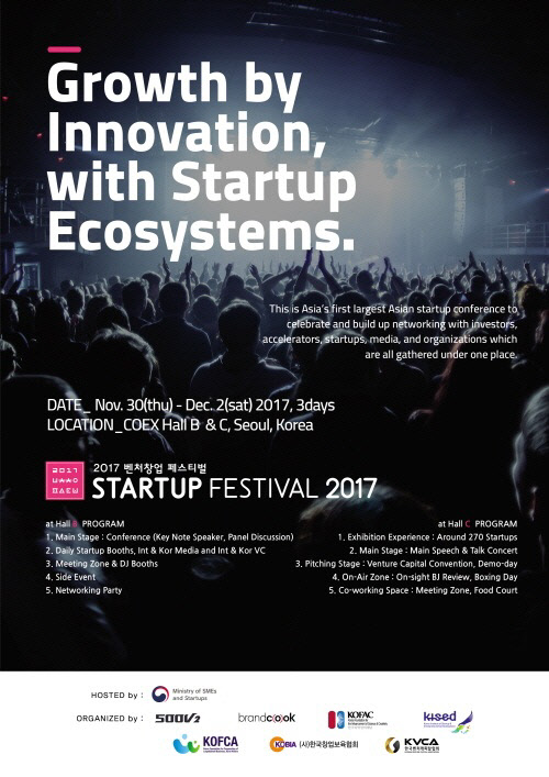 이번 Startup Festival 2017은 '혁신 성장, 스타트업 생태계와 함께!(Growth by Innovation, with Startup Ecosystems)'를 주제로 진행되는 '글로벌 스타트업 행사'로써 스타트업 생태계에 실질적인 비즈니스 기회가 될 전망이다.