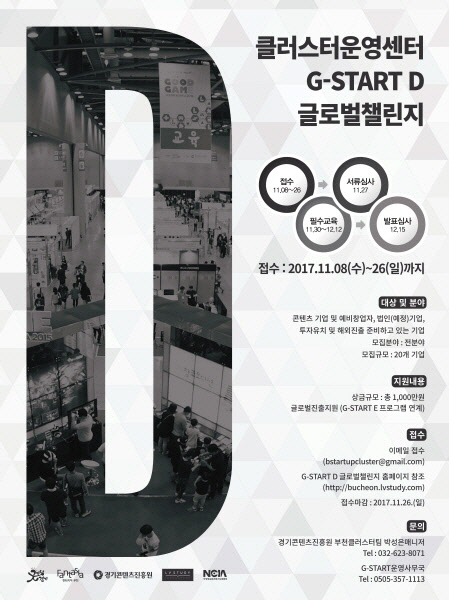이번 '클러스터운영센터 G-START D 글로벌챌린지'의 참가 신청은 경기콘텐츠진흥원 홈페이지 내 사업공고에서 확인 가능하며 신청은 이메일을 통해 할 수 있다.