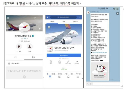 챗봇서비스를 원하는 고객은 카카오톡이나 페이스북 메신저 검색창에 '아시아나항공 챗봇'이나 'asianachatbot'라고 입력한 뒤 대화를 시작하면 된다.