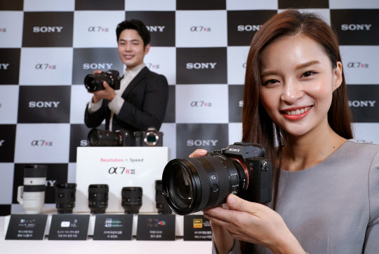 소니코리아는 35㎜ 풀 프레임 미러리스 카메라 '알파7R Ⅲ'와 올인원 줌 렌즈 '셀(SEL)24105G'를 출시한다고 13일 밝혔다. 알파7R III는 4240만 화소의 35㎜ 풀 프레임 엑스모어 R 씨모스(CMOS) 이미지 센서와 이미지 프로세싱 기술을 적용했다. 초당 최대 10연속 촬영이 가능하며, 고해상도 4K 하이다이내믹레인지(HDR) 영상 등을 지원한다. 이날 소니코리아 모델들이 서울 소공동 플라자호텔에서 관련 제품을 소개하고 있다.